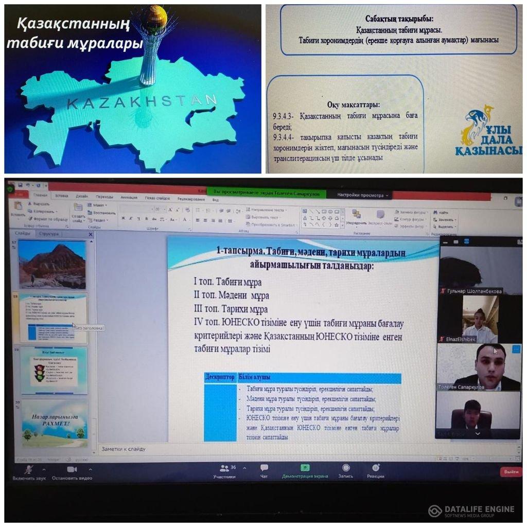 Алматы қаласы, Наурызбай ауданы, №174 мектеп-гимназиясында 28.01.2022ж. “Жаратылыстану” пән бірлестігінің онкүндігінің аясында география пәні мұғалімі Сапаркулов Төлеген 9”А” сыныбына “Қазақстанның табиғи мұралары” тақырыбына ашық сабақ өтті. Мұғалім өзінің сабағында оқушының танымдық әрекетімен ақыл-ойын жетілдіру белсенділігін арттыру мақсатында ZOOM, Mektep online, LearningApps.org сайттарын қолдана отырып, түрлі әдіс-тәсілдерін пайдаланып сабағын жоғары деңгейде өткізді.