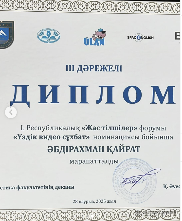 Үстіміздегі жылдың қаңтар-наурыз айларының аралығында ҚазҰУ мен «Ұлан» газетінің ұйымдастыруымен 50-рет дәстүрлі Республикалық Жас тілшілер форумының байқауы өтті. «Үздік видео сұхбат» номинациясы бойынша Наурызбай ауданы №174 мектеп-гимназияның 10-сынып оқушысы Қайрат Әбдірахман жүлделі lll орынға ие болды. Жетекшісі:қазақ тілі мен әдебиеті пәнінің мұғалімі Ордаханова А.Ж.Құттықтаймыз! Жеңісті күндеріңіз көп болсын!