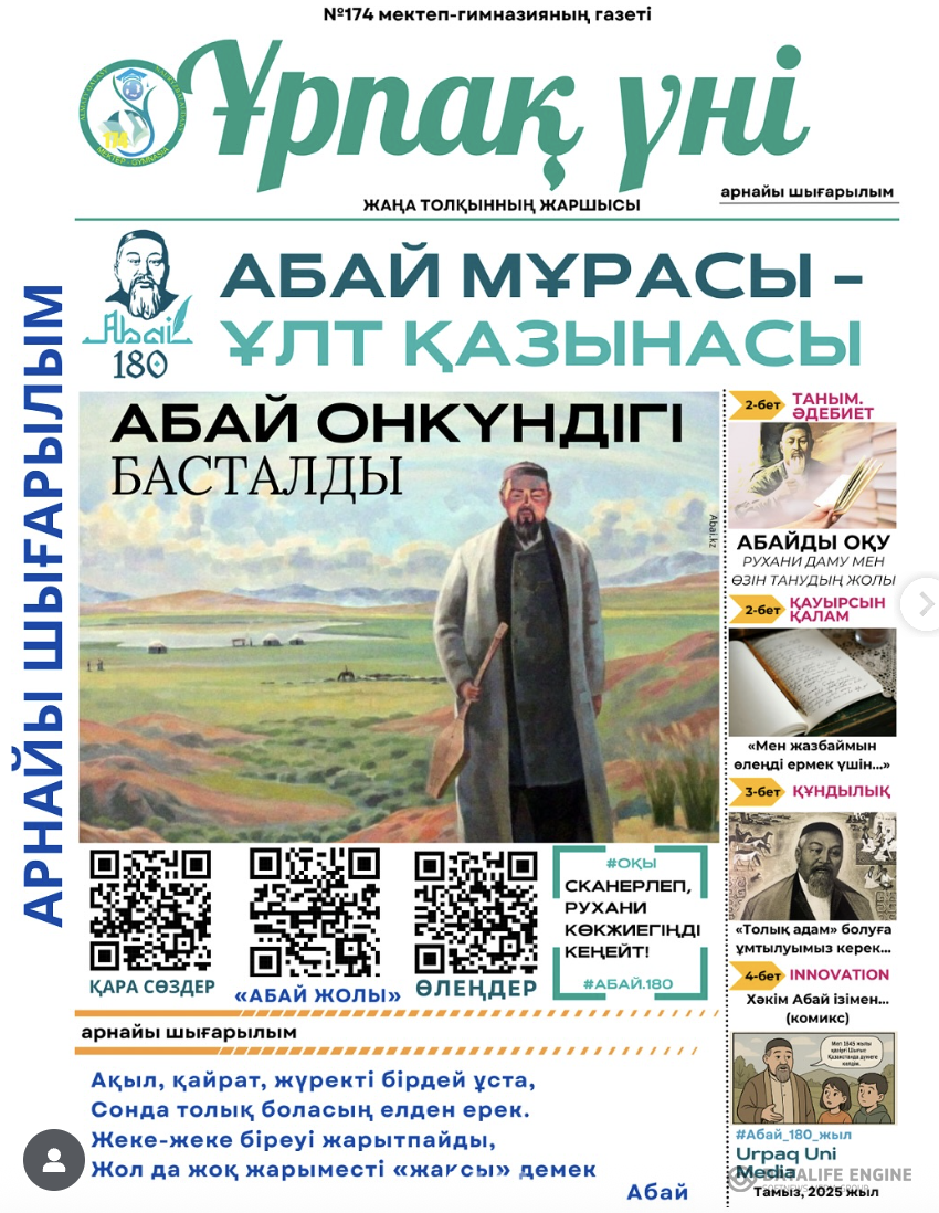 Биыл Абай Құнанбайұлының туғанына 180 жыл! Айтулы датаға орай №174 мектеп-гимназияның мектепішілік «Ұрпақ үні» газетінің арнайы шығарылымы жарық көрді. Бұл нөмір 4 беттен тұратын интерактивті газет. Арнайы QR-кодтар, комикс қамтылған. Оқырман QR-ды сканерлеп, Абай шығармашылығымен толық таныса алады.