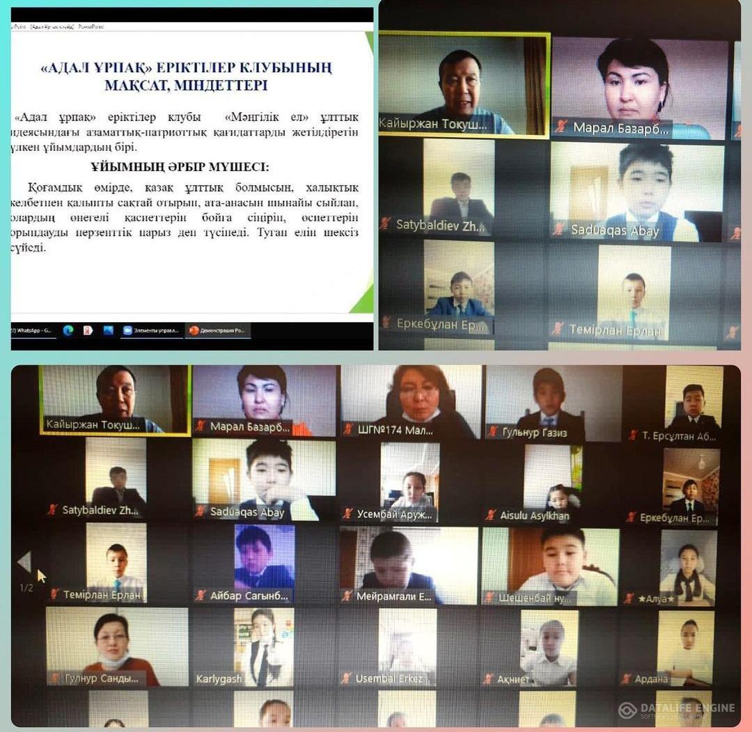 2020 жылдың 30 қазан күні Алматы қаласы Наурызбай ауданы №174 мектеп - гимназиясында «АДАЛ ҰРПАҚ» еріктілер клубының мүшелігіне оқушылар қабылданды. Онлайн форматта өткізілген іс-шара Республикалық «Sanaly urpaq» жобалық кеңсесінің жетекшісі Қайыржан Ахметбекұлы Токушевтың қатысуымен өтті. Кездесу барысында мектебіміздің басшысы Маликова Арнагуль Мусразовна клубтың жаңа мүшелеріне құттықтау тілектерін айта отырып, алға қойған жұмысты жоспарлы, жүйелі жүргізуге шақырды. «Адал ұрпақ» клубына мүшелікке қабылданатын оқушылар өздерін таныстырып, ант қабылдап, клубқа ресми түрде мүшелікке қабылданды.Қ.А.Токушев «Адал ұрпақ» клубына мүше болған оқушыларды құттықтап, атқарылатын іс-шараларды тізбектеп көрсетіп, нақты ұсыныстар енгізді. Парасаттылық мектебі арқылы адами құндылықтарды оқушылардың санасына сіңіру керектігін айтып, осы мақсатта «Sanaly urpaq» жобасының аясында дайындалған әдістемелік нұсқауларды түсіндірді.