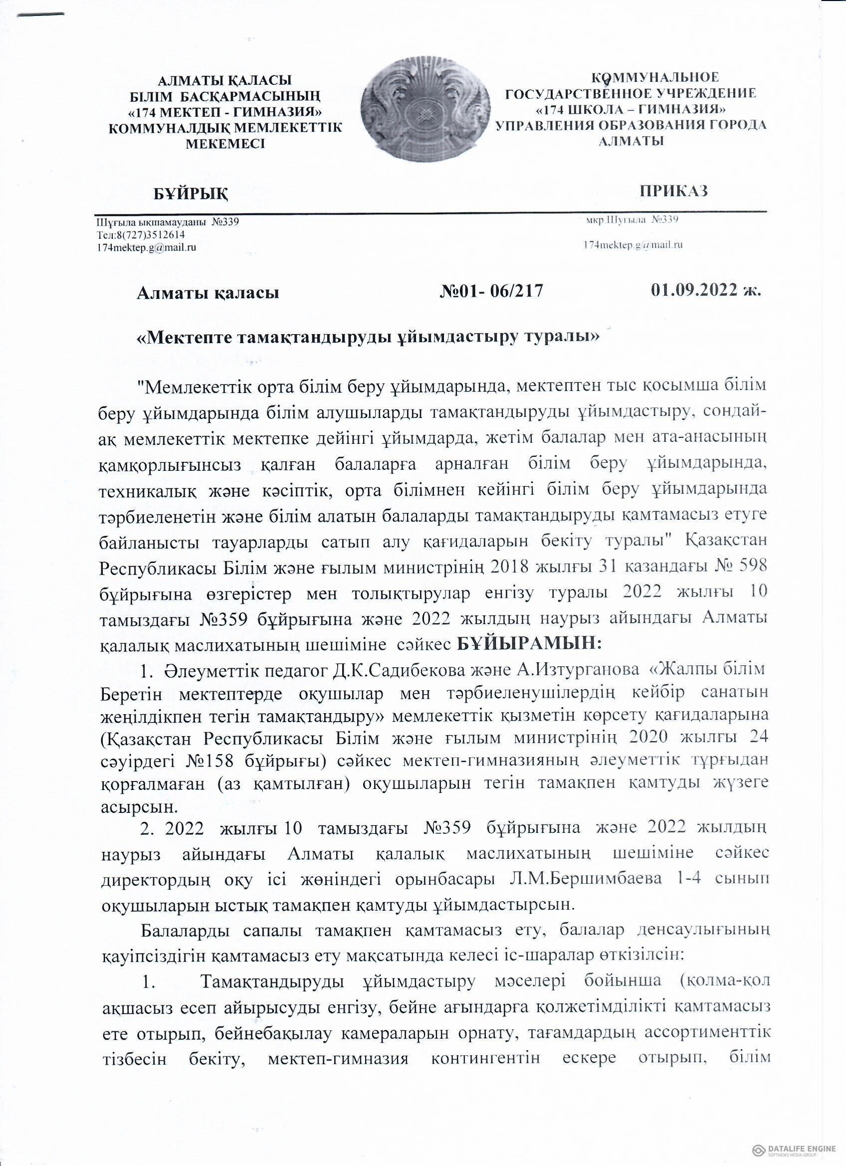 01 сентябрь 2022 0 1 2 3 4 5 Мектепте тамақтандыруды ұйымдастыру туралы бұйрық Осы беттің QR-коды:QR-код этой страницы: