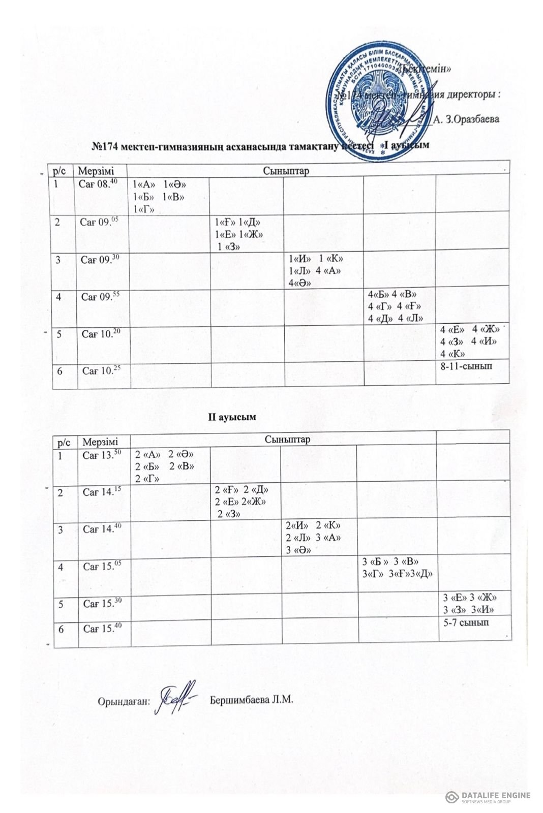 174 мектеп-гимназияның асханасында тамақтану кестесі