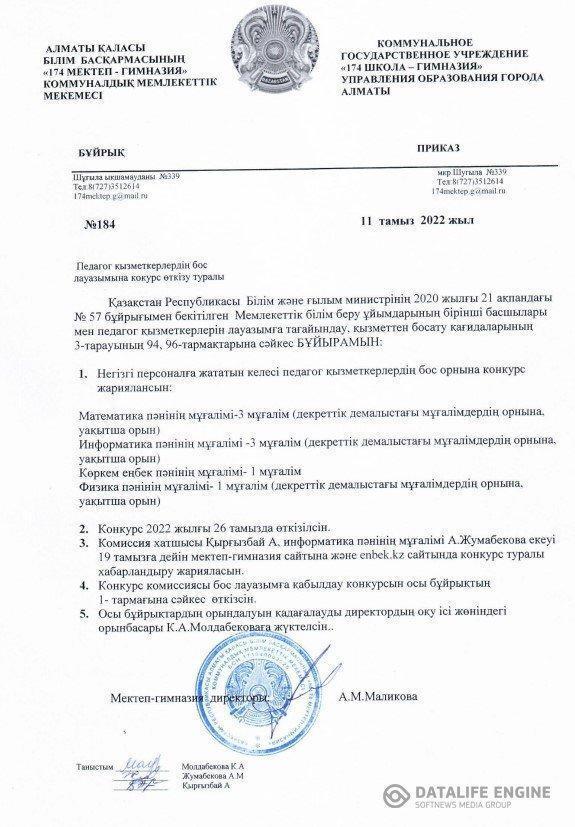 15 август 2022 0 1 2 3 4 5 Педагог қызметкерлердің бос лауазымына конкурс өткізу туралы bos-oryn.pdf [366,41 Kb] (cкачиваний: 60) Посмотреть онлайн файл: bos-oryn.pdf Осы беттің QR-коды:QR-код этой страницы: